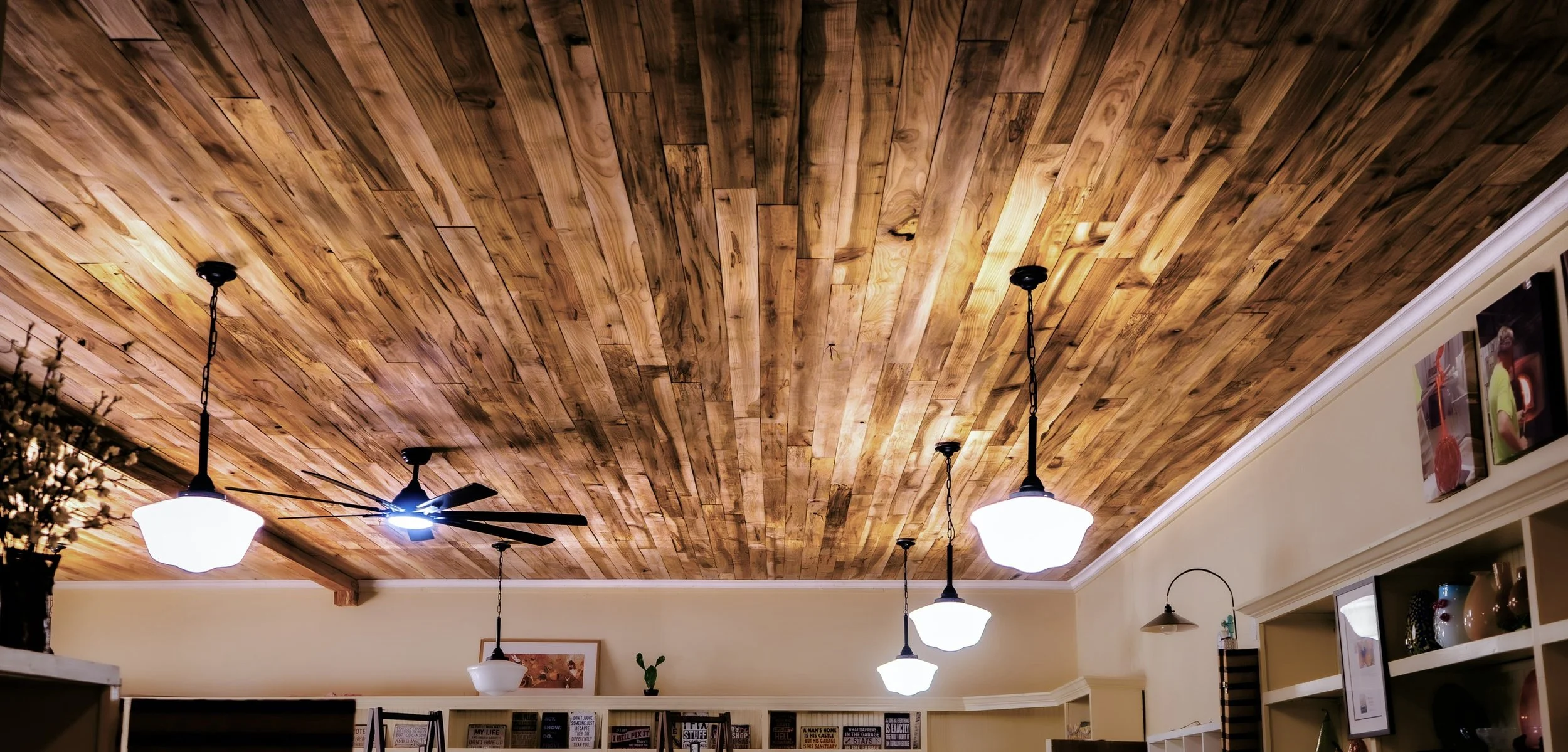 Our client wanted to bring back the charm to this Cedar Mountain roadside gallery. The historic space was the perfect canvas for a maple ceiling.The ceiling was completely reimagined with hand-selected maple boards, each one carrying its own quiet grain patterns and warm, honey-rust tones.A light, hand-rubbed coconut oil finish deepens the amber tones of the maple without overpowering its natural texture.